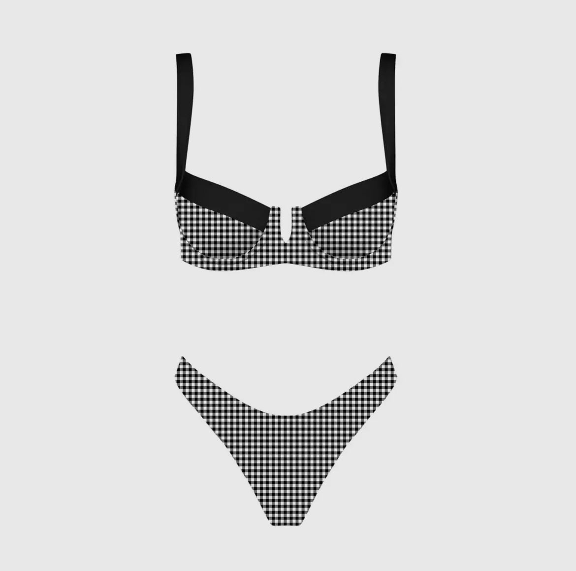 Stunning balconette top with removable pads and the cutest black & white print and contrast. High leg cut bottom for a retro look.