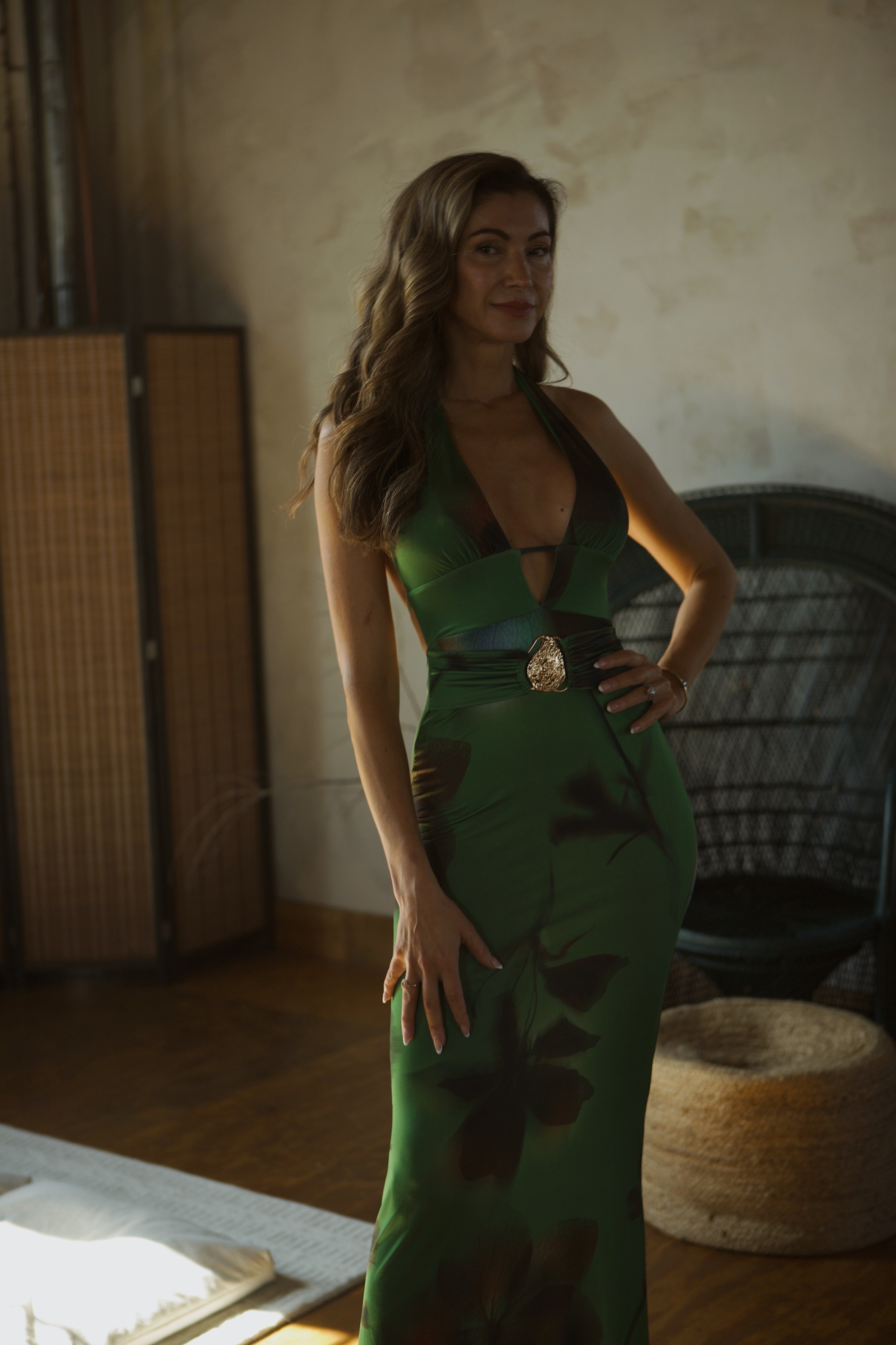 Stunning maxi dress featuring a plunge neckline and open back. Beautiful golden accent in the front. Soft and fluid fabric accentuates perfectly the body shape.