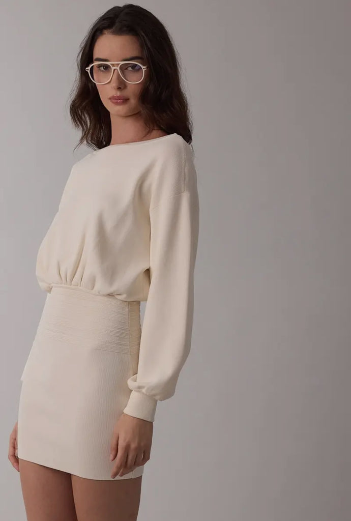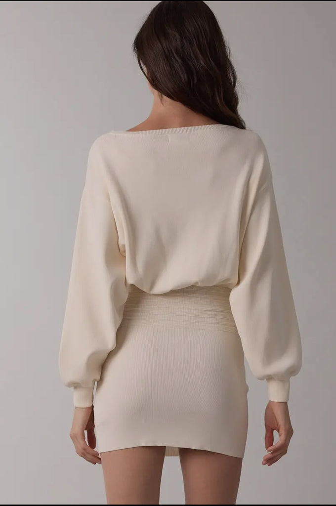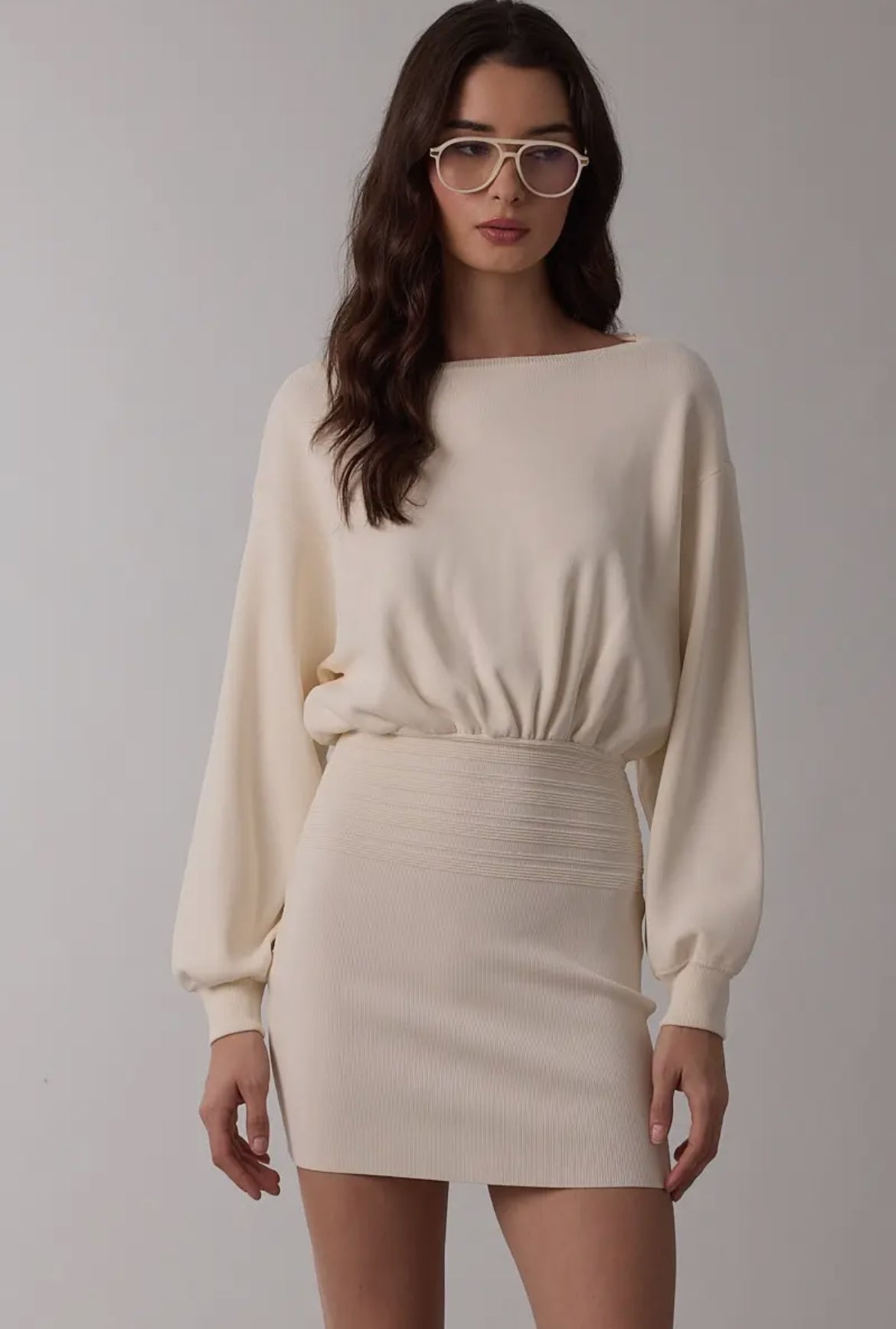 Classic sweater mini dress with long puffy sleeves. The fit is perfect!!