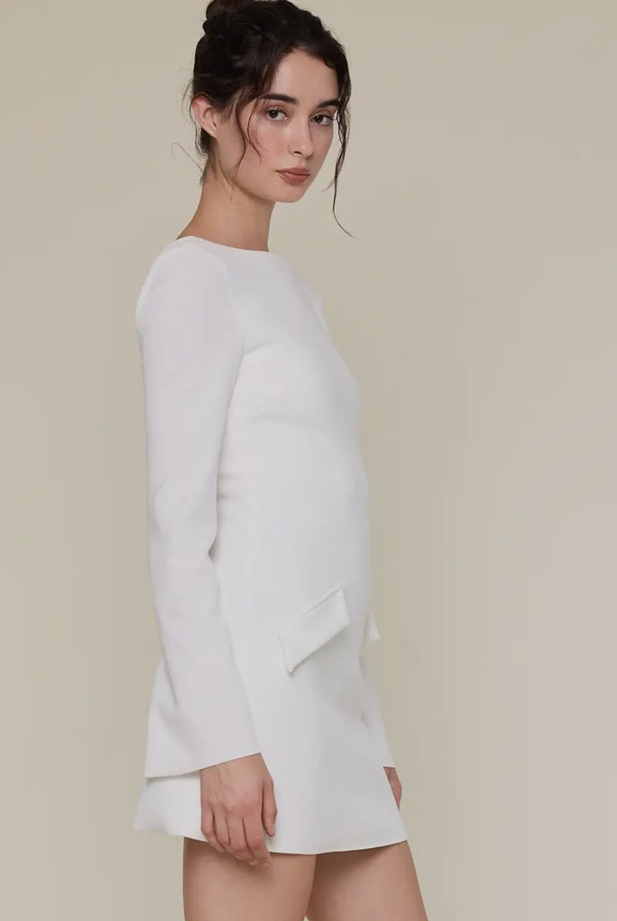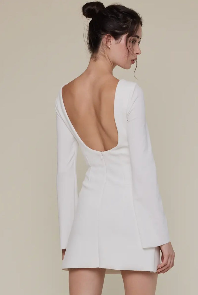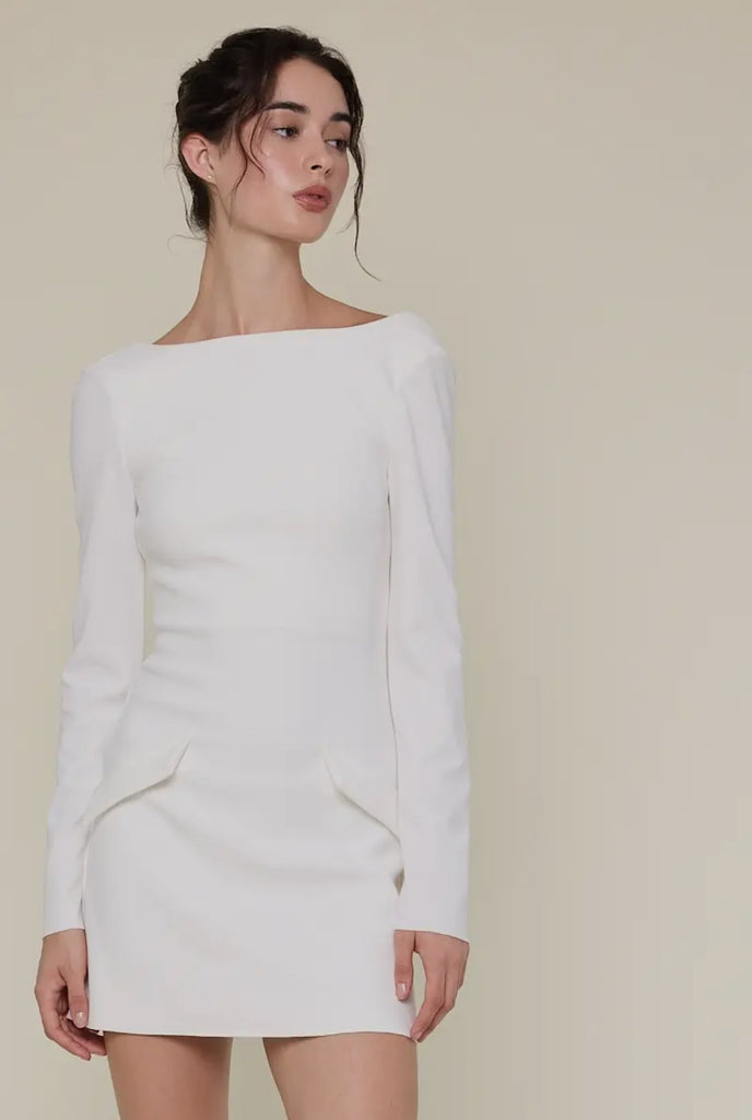 Stunning long sleeve white short dress. Tailored style, with low back, boat neck, invisible zipper and stretchy thick fabric. Absolutely gorgeous!