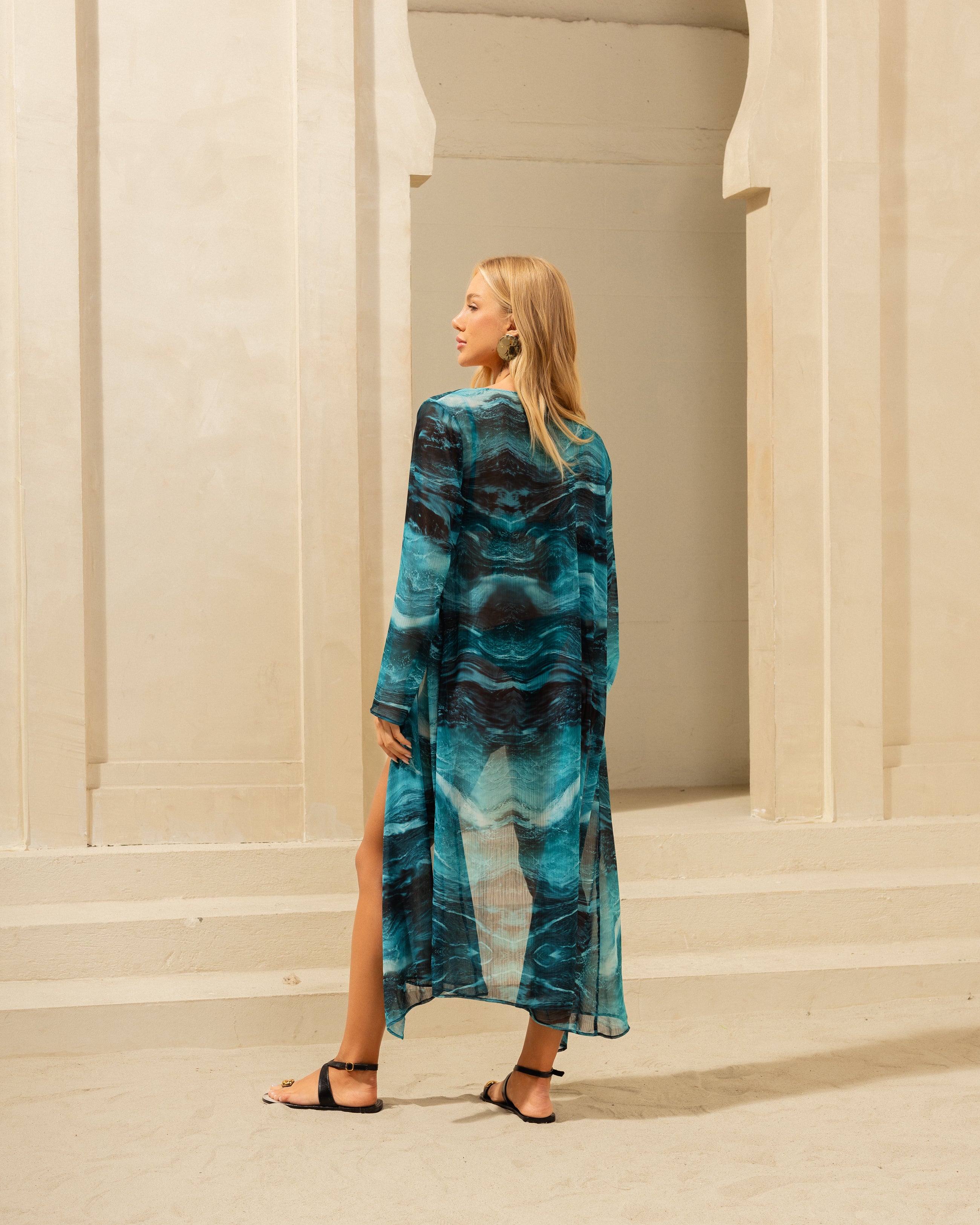 Stunning deep blue print makes this cover up a showstopper. Light crepe fabric has the perfect fluidity.