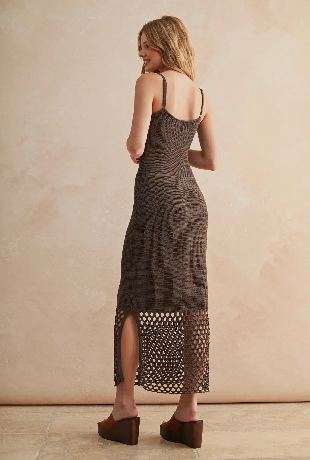 Channel dreamy evenings and effortless elegance in this romantic open-stitch knit maxi dress. Designed to hug your curves in all the right places, it features delicate spaghetti straps, a snug-fit bodice, and a flattering bodycon silhouette that flows into a maxi-length hem. Perfect for warm nights, date dinners, or beachside getaways.