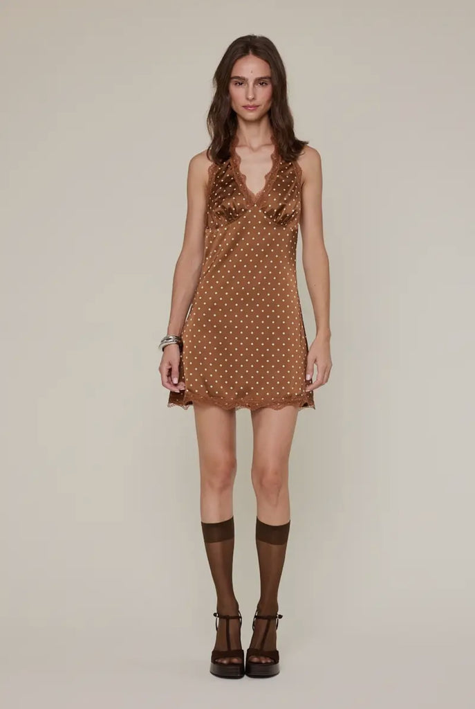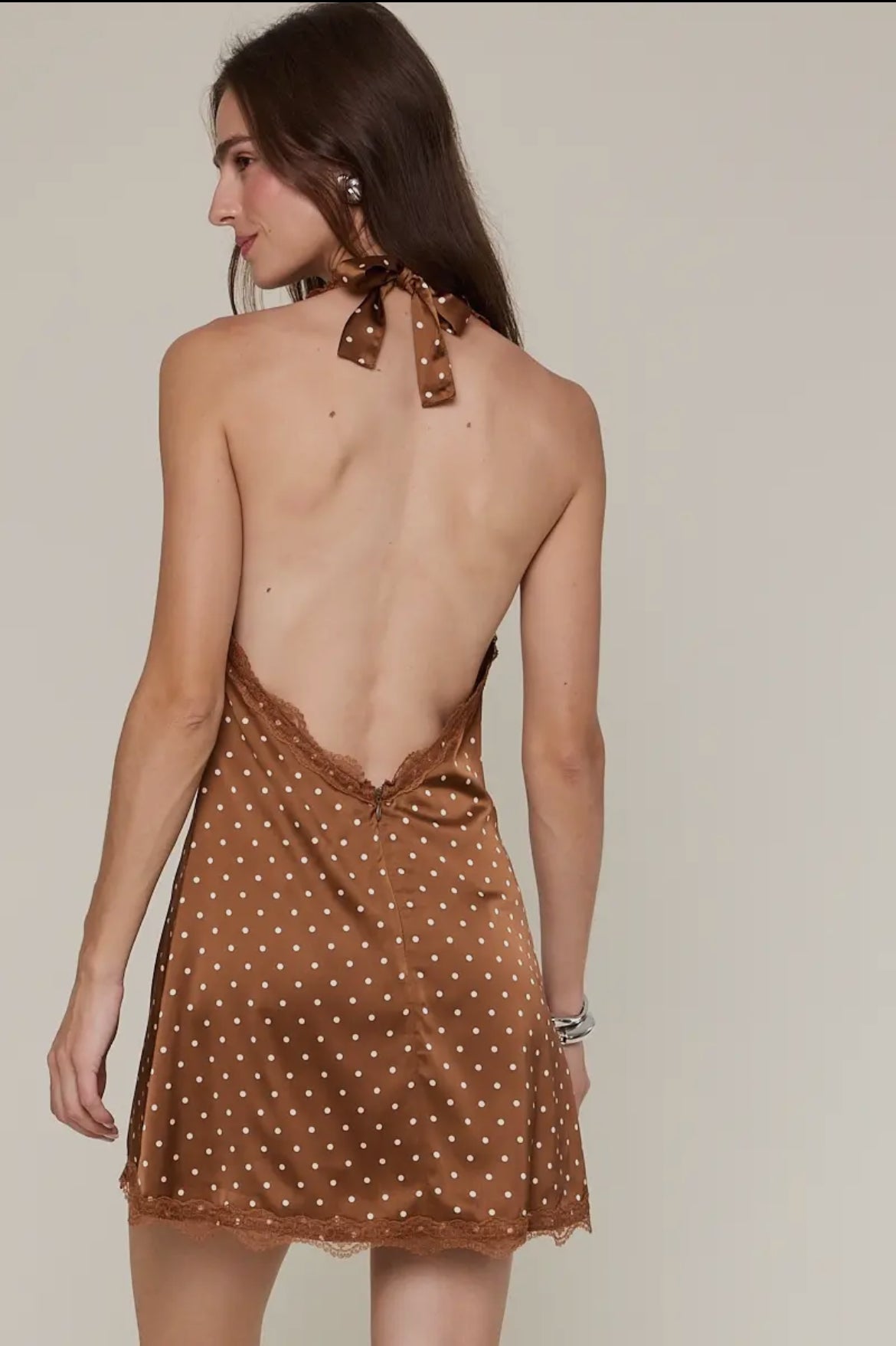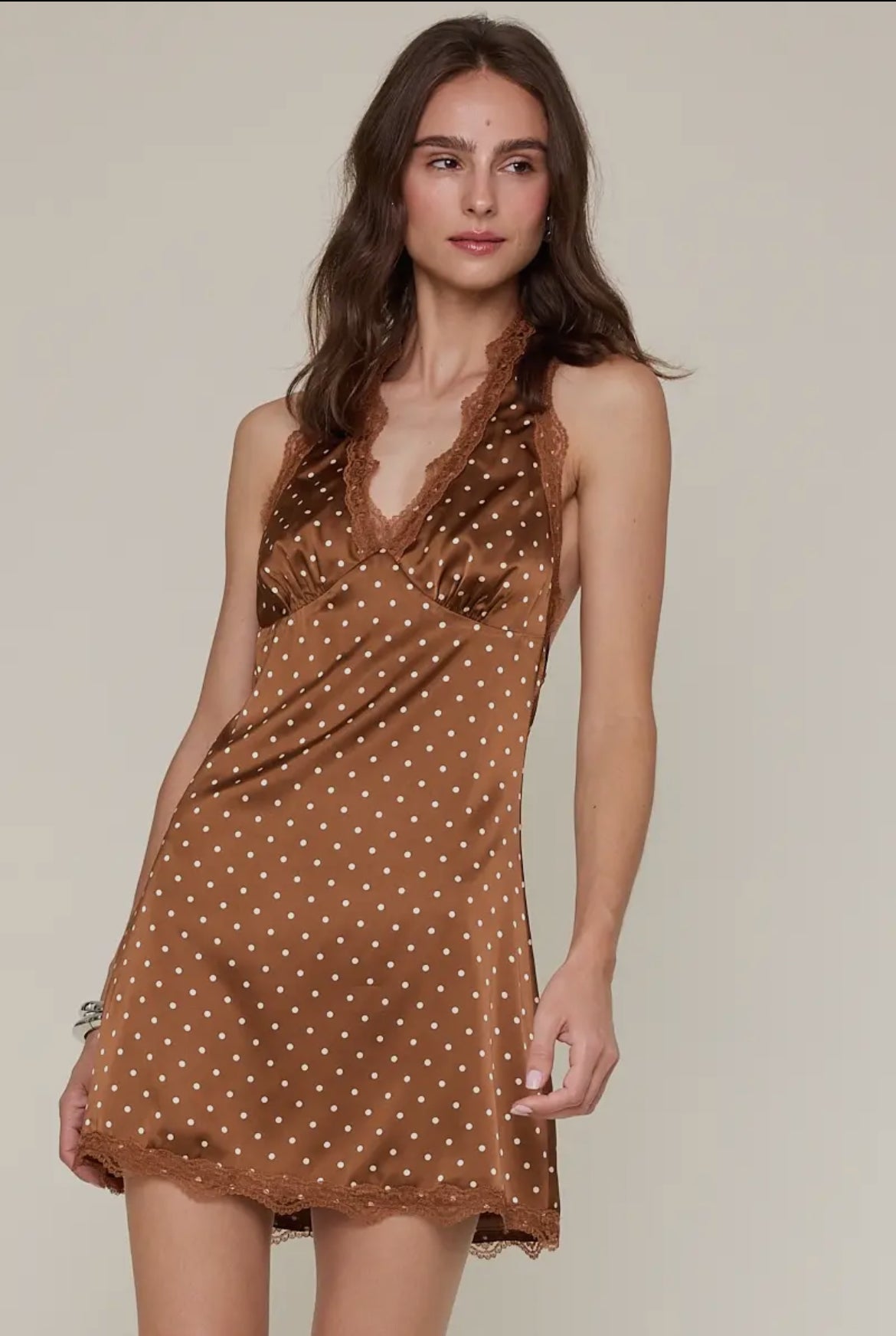 The fall slip dress you need! Silky material, halter and lace make this dress the perfect addition to your wardrobe. Caramel color with polka dots.