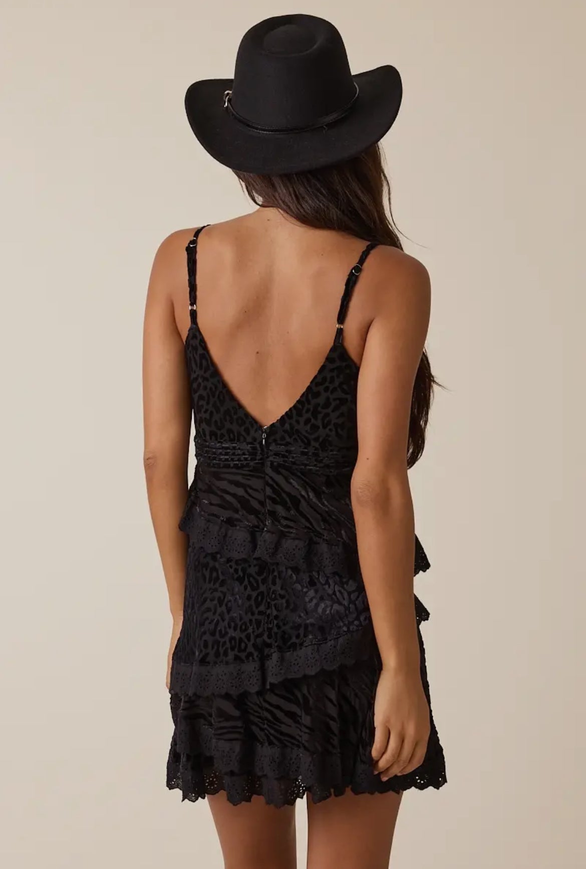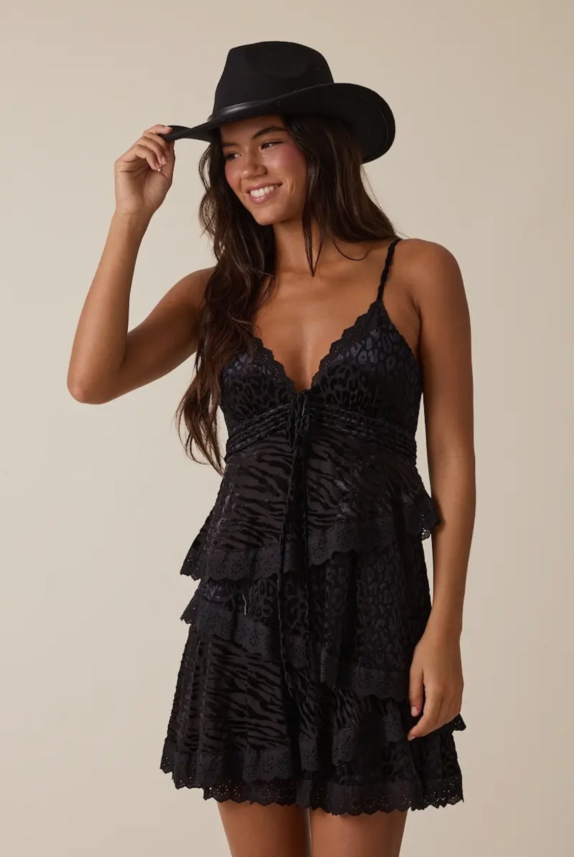 Gorgeous sweetheart neck short dress with tiered ruffle lace hem. Beautiful black animal print. Easy to dress up or down. Looks great with pumps, wedges or boots.